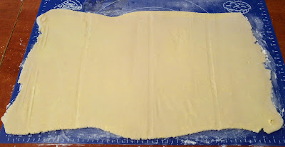 Miután megkelt rizslisztes szilikonlapon átgyúrtam és két gombócra osztottam. Mindkettőt oválisra kinyújtottam,kb. 28x15cm-esre. Majd sütőpapíros tepsibe fektettem őket.